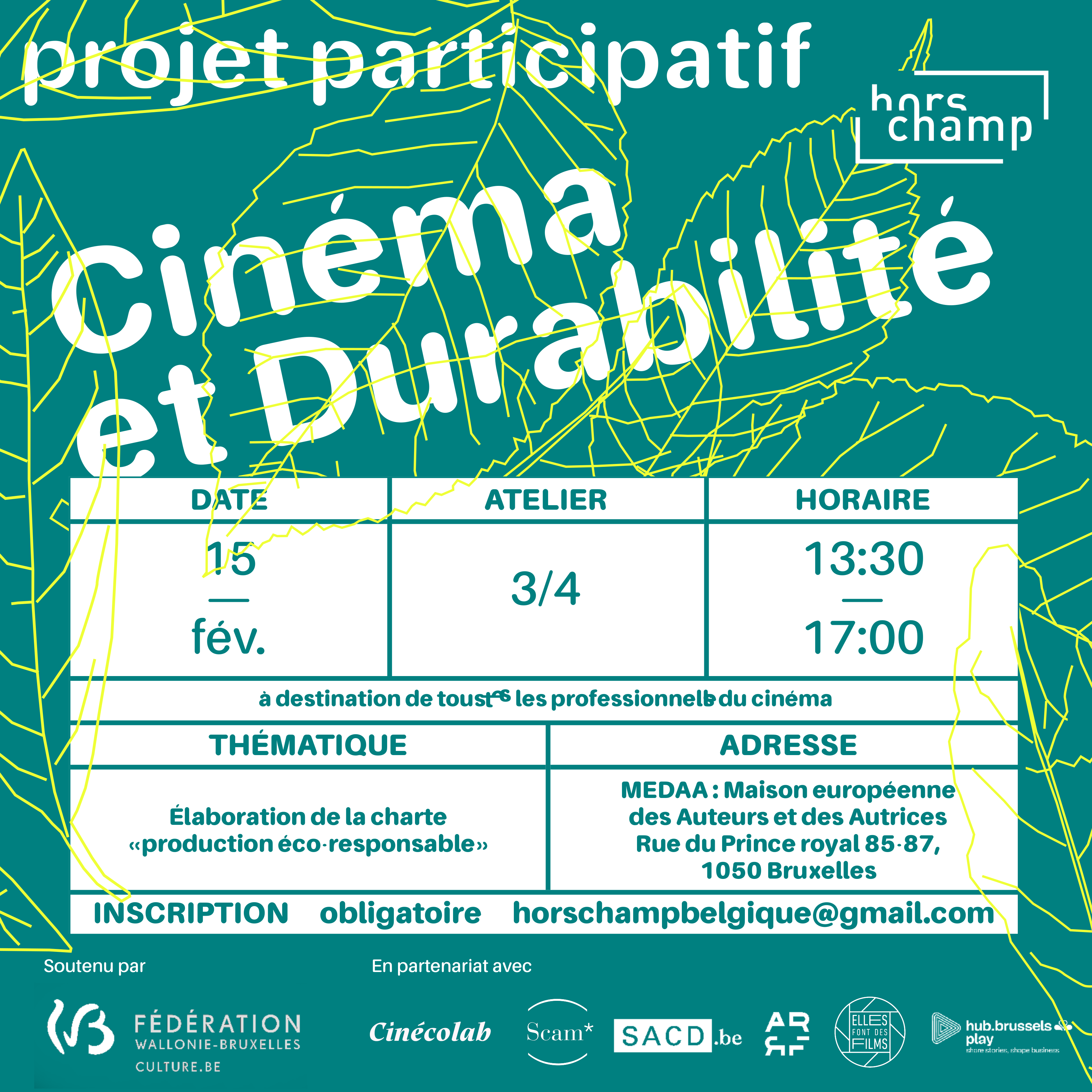Hors Champ is a Belgian Recognised Professional Federation (FPR) that brings together and represents cinema and audiovisual technicians from all professions. To promote four workshops on sustainability in cinema, visuals were created in HTML and CSS. The various draft proposals can be viewed in screenshots.