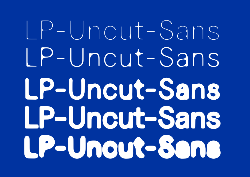 LP-Uncut-Sans is a fork from the typeface Uncut for Living Earth Festival. It has been distorted using Living Path software, a tool that mimics behaviours found in nature and applies them to the vector shapes of glyphs. Living Path is developed by Ivan Murit.