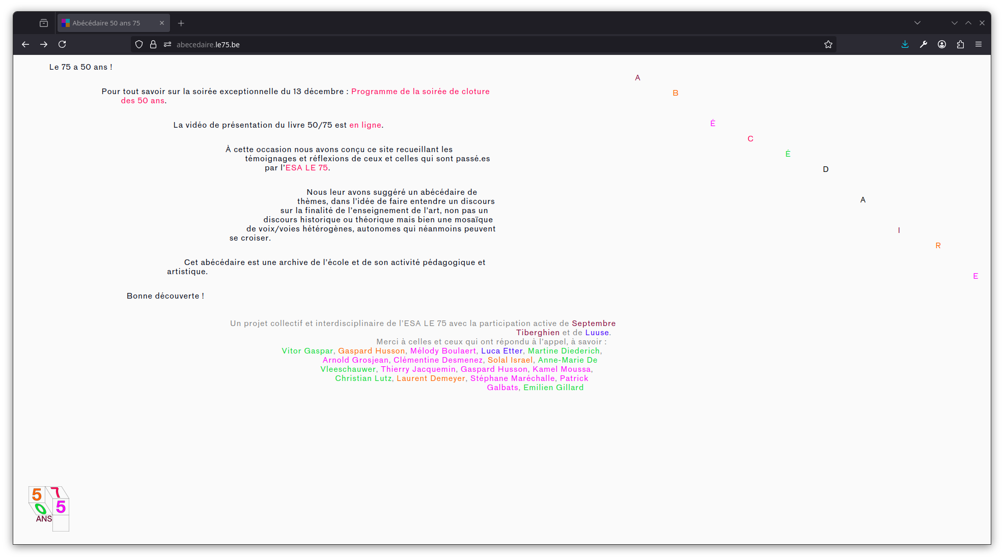 Website designed in colaboration with École Supérieure d'Art du Septante cinq, for the school 50th anniversary. It displays short audio and video life stories, made by former students and teachers.