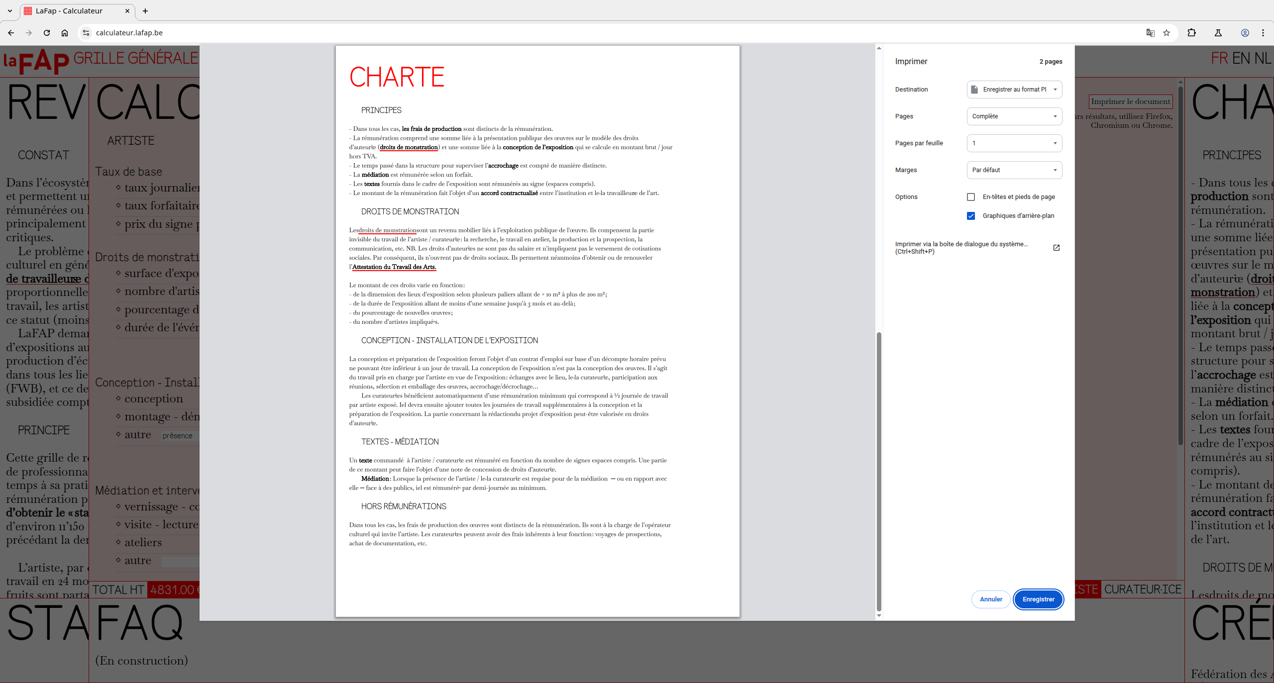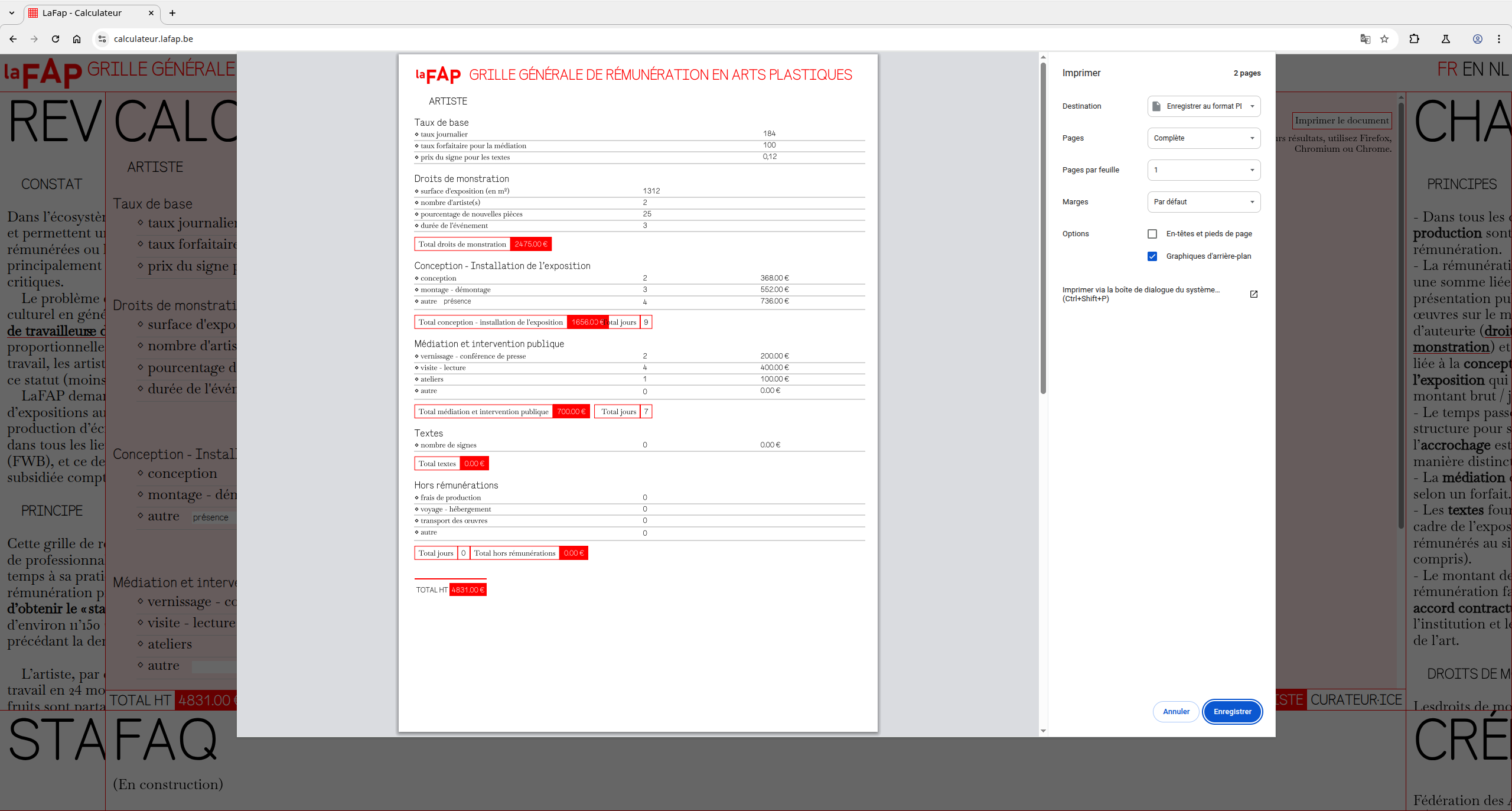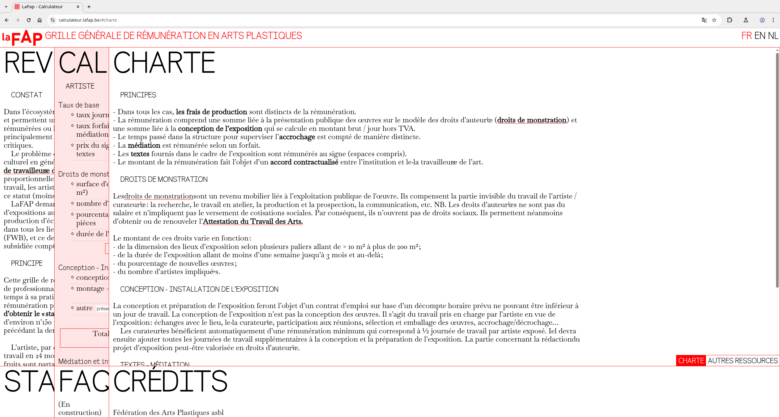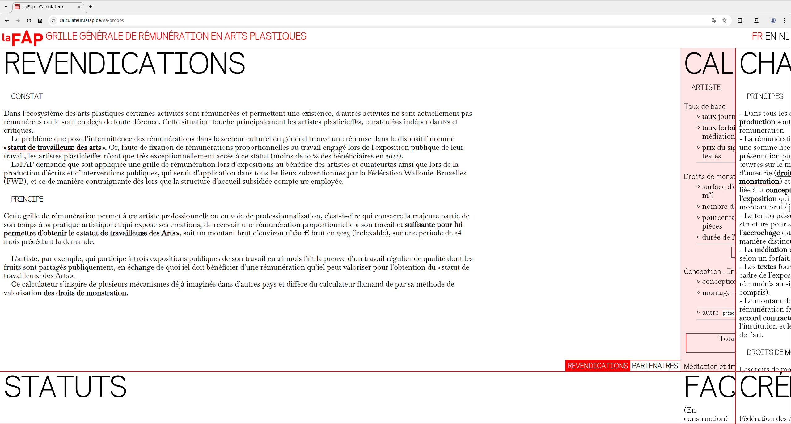 Design and development of an online calculator for laFap (Federation of Plastic Arts), aimed at estimating fair remuneration for artists and curators in Wallonia-Brussels.