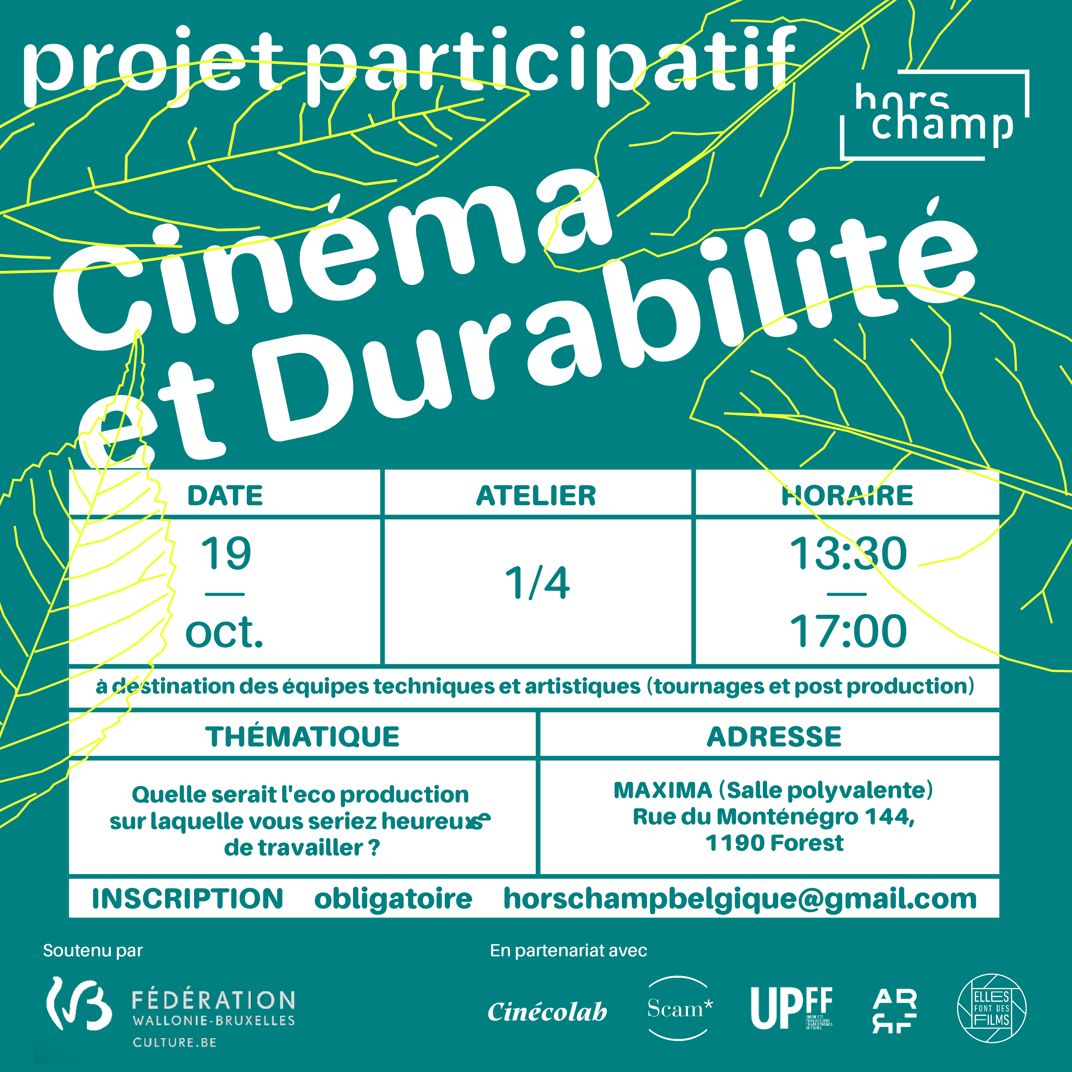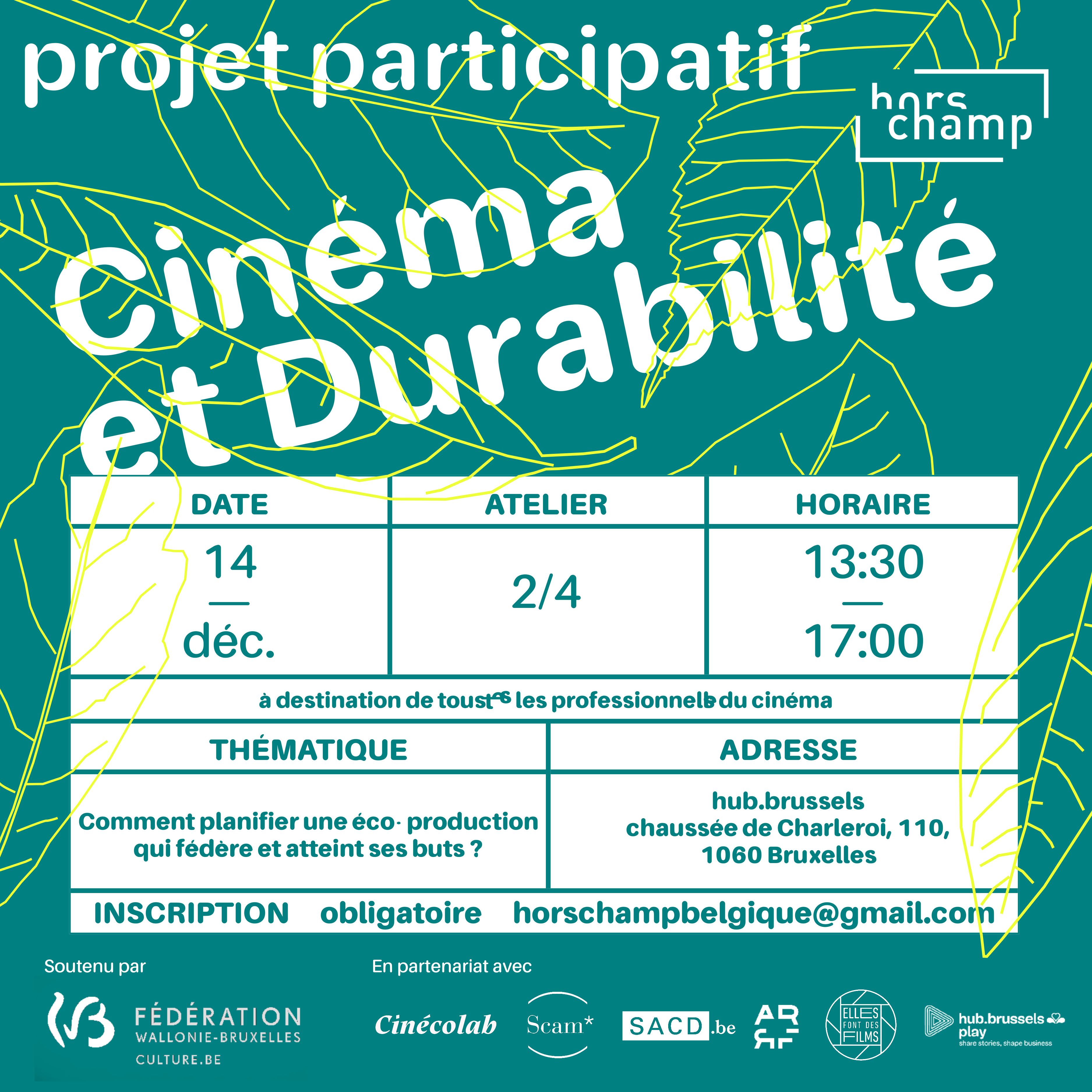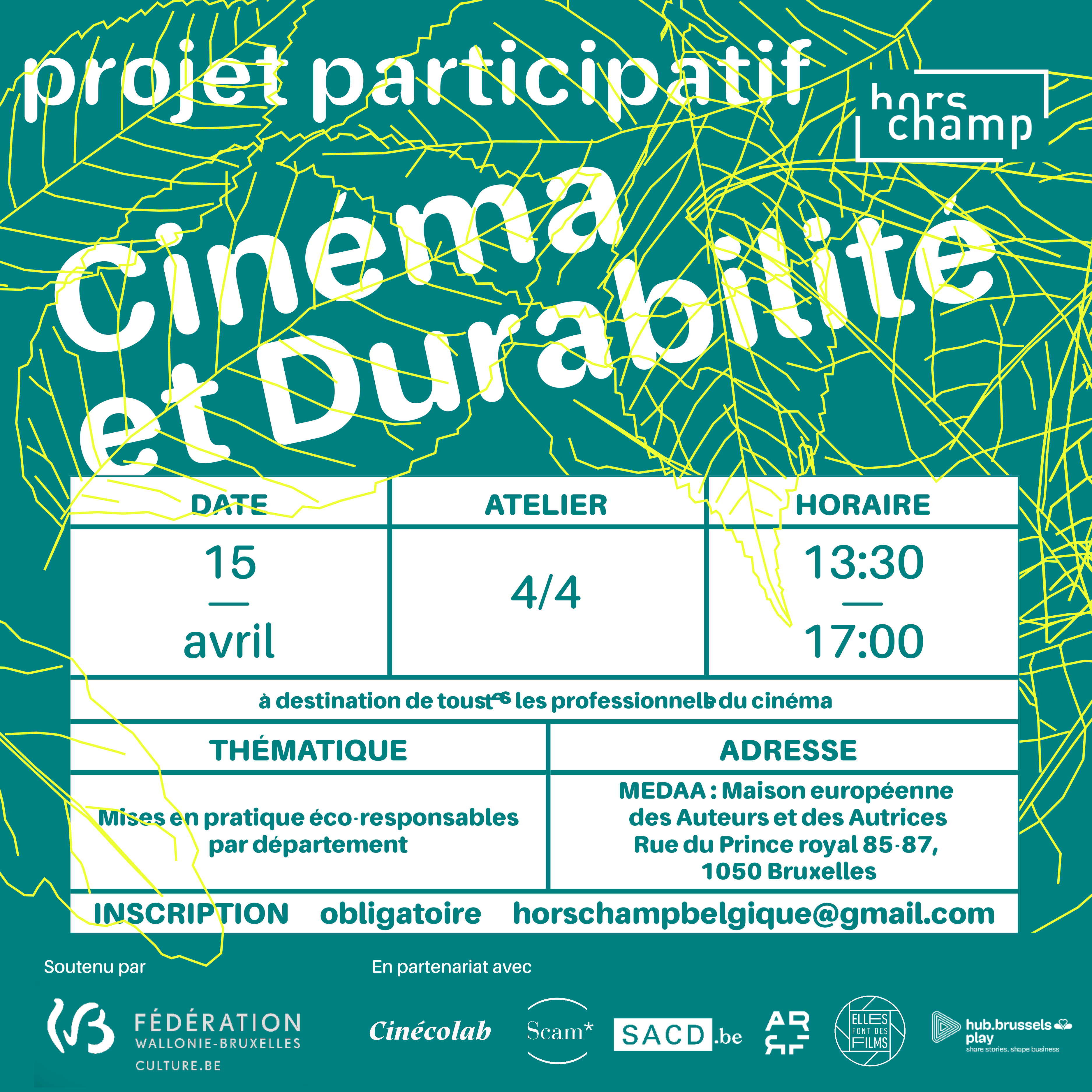 Hors Champ is a Belgian Recognised Professional Federation (FPR) that brings together and represents cinema and audiovisual technicians from all professions. To promote four workshops on sustainability in cinema, visuals were created in HTML and CSS. The various draft proposals can be viewed in screenshots.