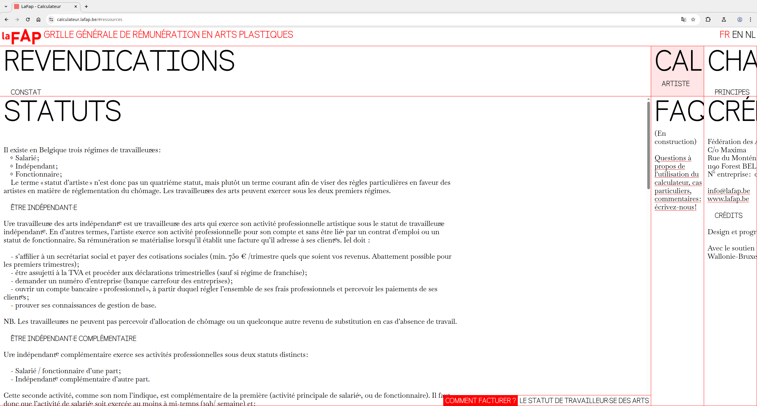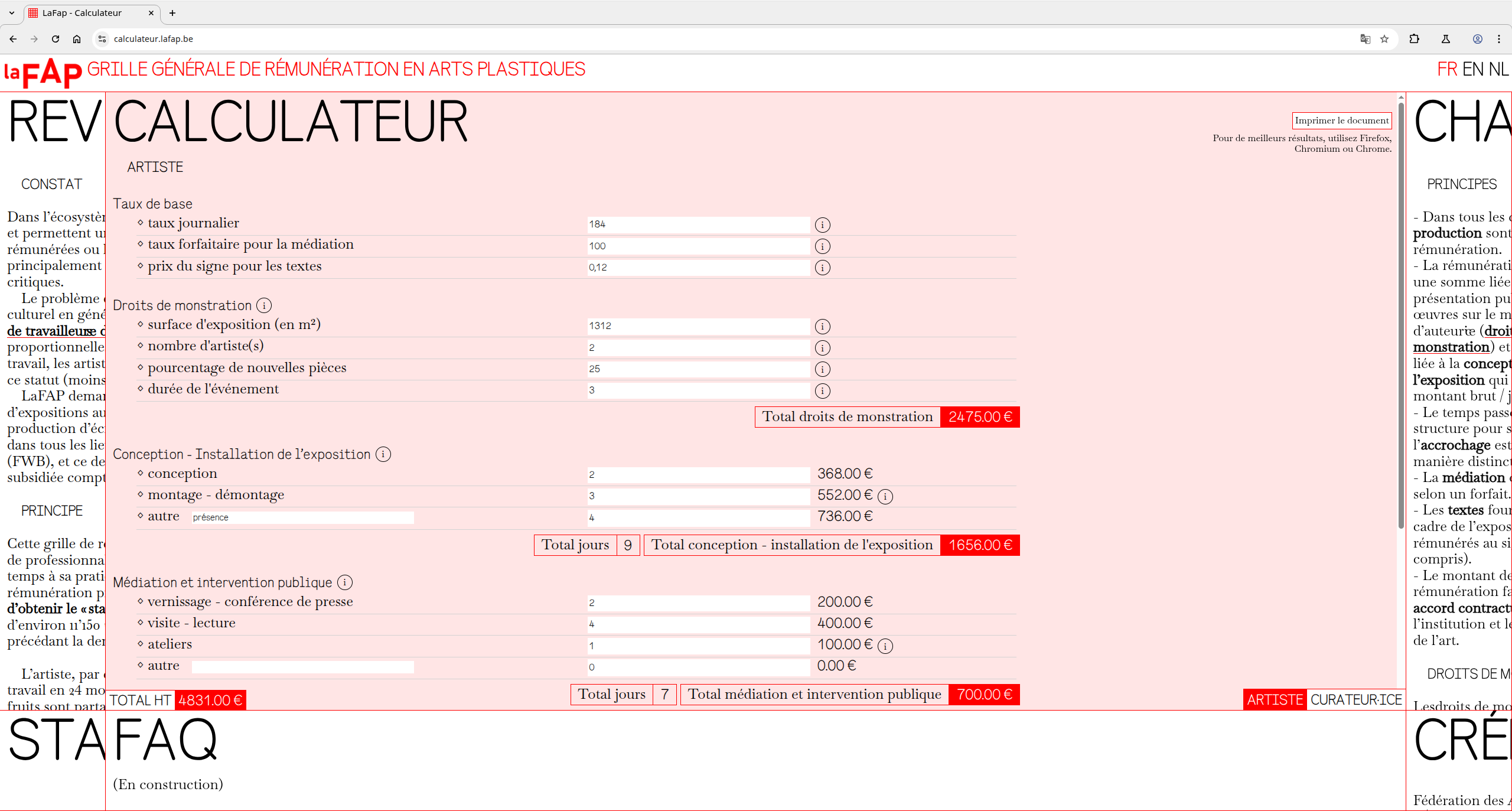 Design and development of an online calculator for laFap (Federation of Plastic Arts), aimed at estimating fair remuneration for artists and curators in Wallonia-Brussels.